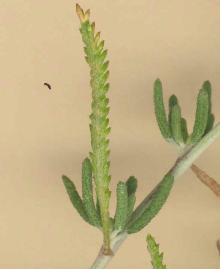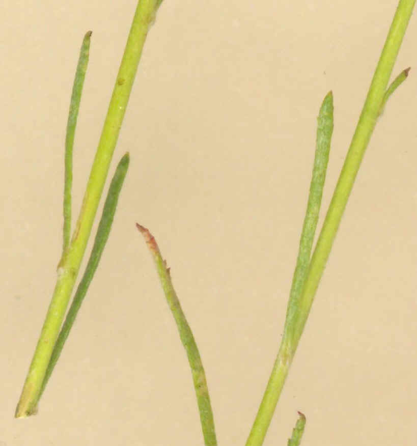 Blätter der nichtblühenden Sprosse linealisch, 3 - 9 mm lang, 1 mm breit, warzig oder schuppig, sitzend oder kurz gestielt, in den Achseln wesentlich längerer Tragblätter