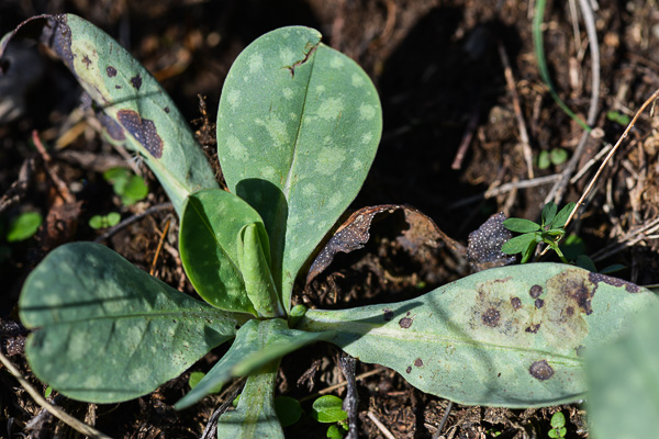 Grundblätter breit oval- spatelförmig, blaugrün, mit weißen Punkten, am Rand oft violett