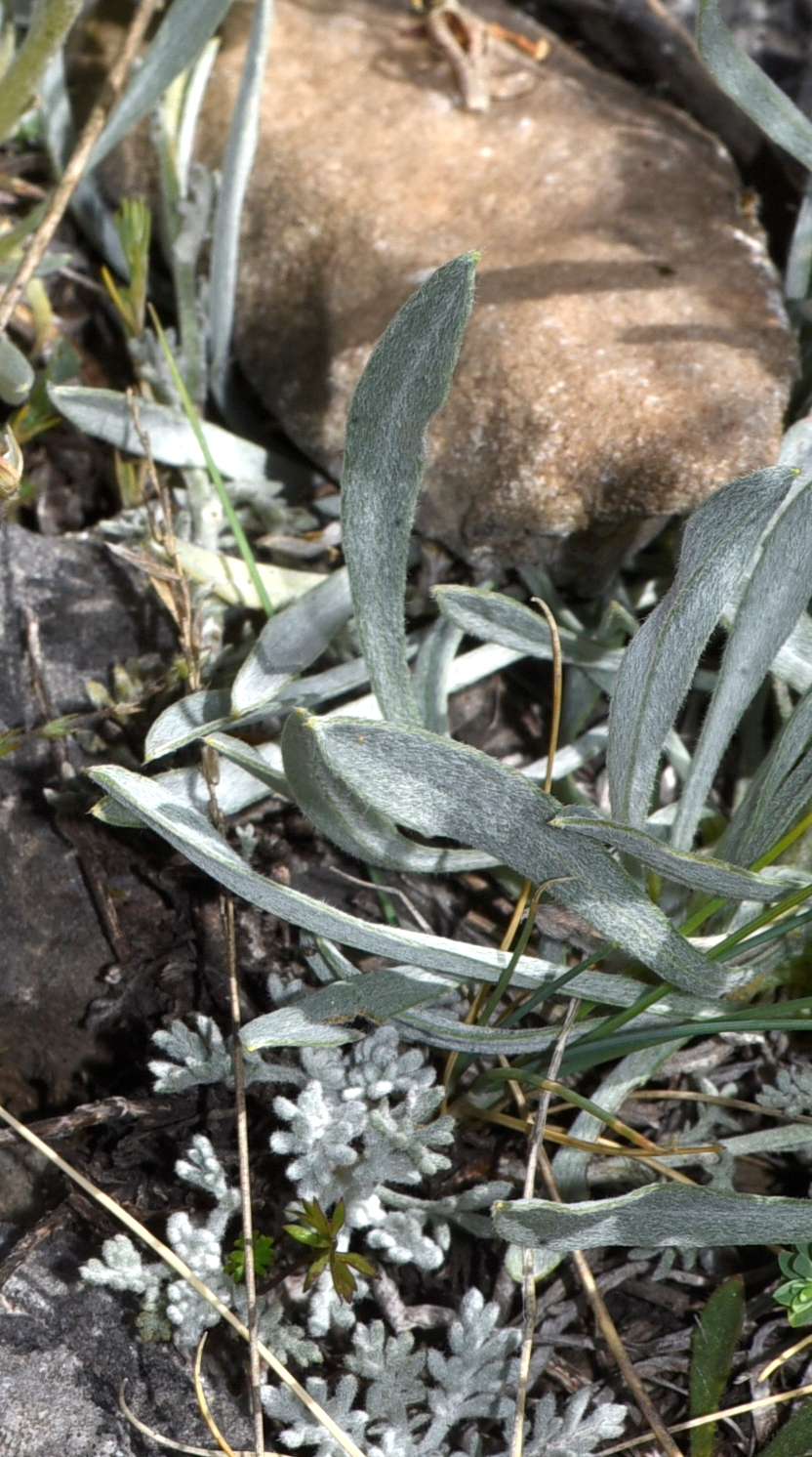 Rosettenblätter 3 - 12 cm lang, 2 - 9 mm breit, linealisch, dichtgrauwollig behaart