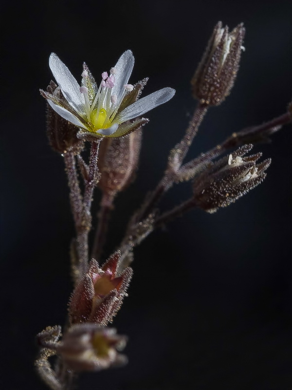Blüten weiß, sternförmig, Kronblätter 4 mm lang, schmal, wenig länger die Kelchblätter, nicht deckend, Staubblätter ca. so lang wie der Kelch, Antheren 0,5 mm