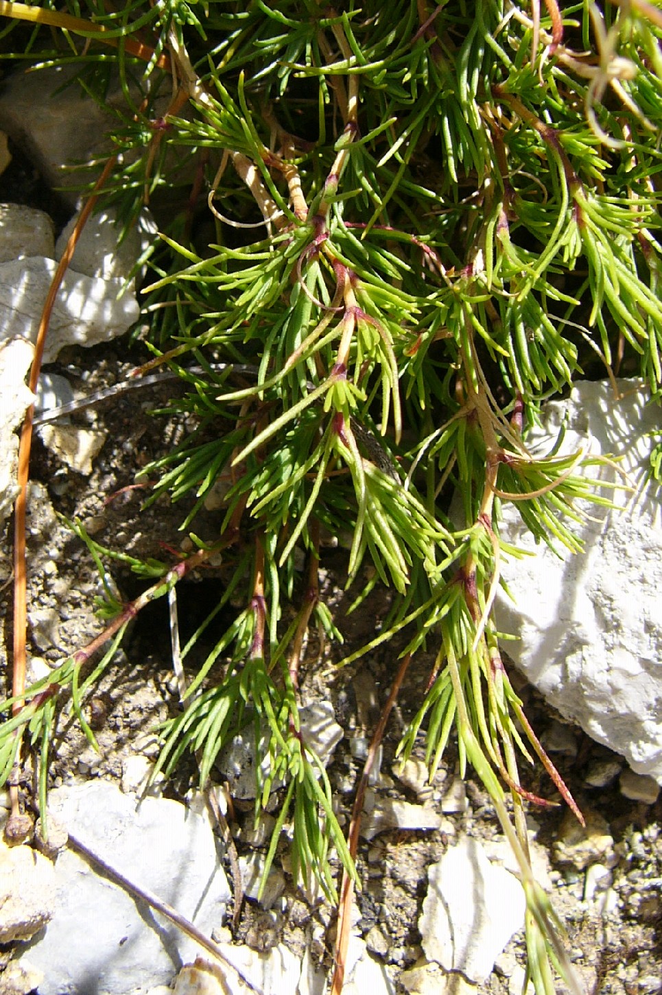 Kapsel 1 - 1,5 mal so lang wie die Kelchblätter, Stängel aufsteigend, unten verzweigt, mit Blattbüscheln, oben kurz behaart, mit kleinen Drüsen. Blätter der fertilen Sprosse bis 10 mm lang, 0,5 mm breit, linealisch, einnervig