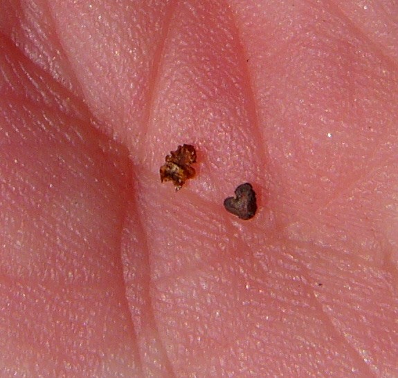 1 - 1,7 mm lang, dreieckig- nierenförmig, an den Seiten flach
