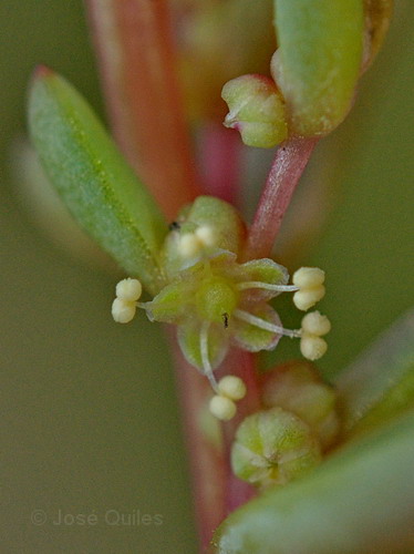 Tragblätter ca. 10 mm lang, 2 mm breit, abgeflacht, länger als Internodien und Blütenknäuel, Blüten in achselständigen Knäueln zu 3 - 7, locker bis sehr dicht stehend, mit 1 - 3 Staubblättern