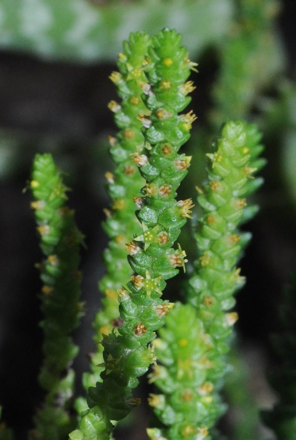 langen Trieben Blätter eiförmig, spitz, Blüten winzig > Crassula muscosa