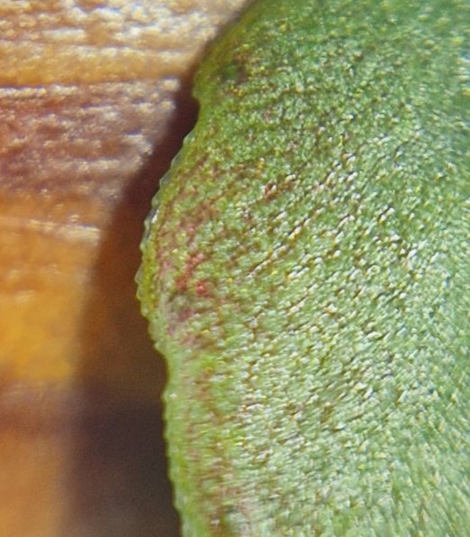 Blätter 12 - 20 mm lang, 6 - 8 mm breit, elliptisch, fleischig, flach, gegenständig, +/- gezähnt, in einen 5 - 10 mm langen Stiel verschmälert, nichtblühende Triebe bis 30 cm lang, rötlich, bilden an den Knoten Ausläufer