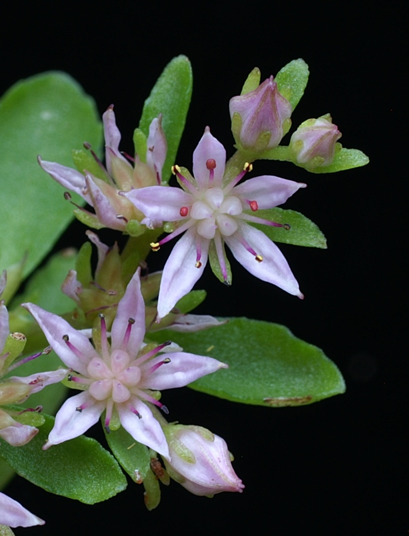 1 Kronblätter rosa, 5 - 8 mm lang, Blätter 5 - 10 mm lang gestielt, Blattrand kurz papillös