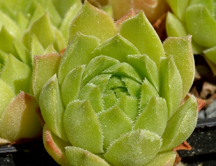Rosettenblätter 10 - 30 mm lang, 7 - 10 mm breit, beiderseits +/- behaart, mit oder ohne rote Spitze, Wimpern am Rand doppelt so lang wie die Haaren auf der Fläche