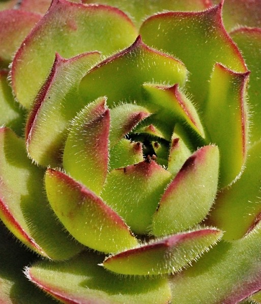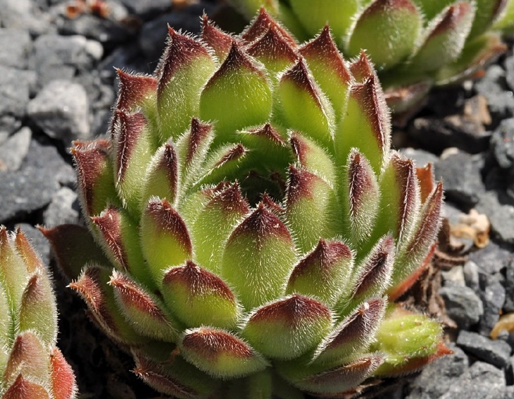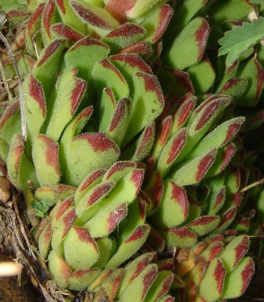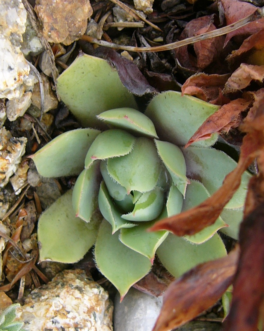 Rosetten 4 - 8 cm im Durchmesser, Rosettenblätter blaugrün, beiderseits kahl, randlich bewimpert, am Grund rotviolett, mit Stachelspitze