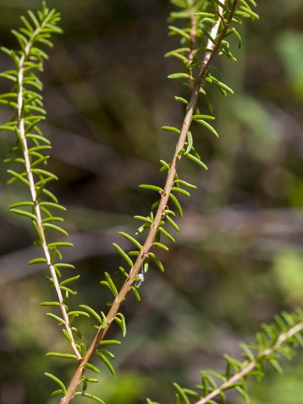 Früchte = vierfächrige Kapseln Junge Zweige behaart, Blätter zu 3 - 4 quirlig, kahl, nadelförmig, glänzend