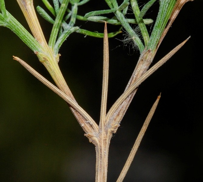 Samen 2 - 3 mm lang, eiförmig, schwarz Zweige anfangs silbern seidenhaarig, mit 6 Rippen, später verkahlend, stark dornig