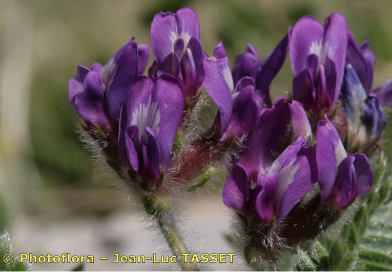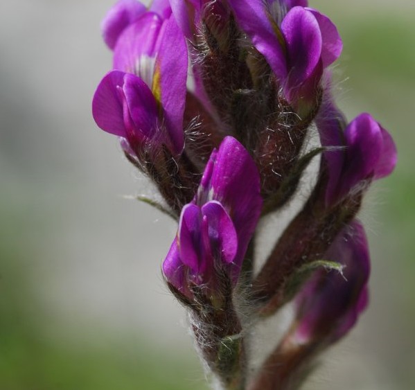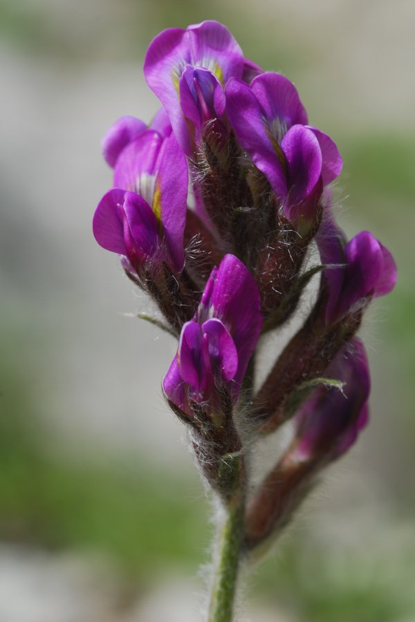 Blütenstand mit 7 - 13 Blüten, Krone kräftig violett, Fahne 17 - 21 mm lang, mit weißen und gelblichen Flecken oder Schiffchen 12 - 14 mm lang, mit pfriemlicher Spitze, Kelch 12 - 13 mm lang, Mittlere Kelchzähne 3,5 mm lang, kürzer als die dicht langhaarige, ca. 9 mm lange Kelchröhre