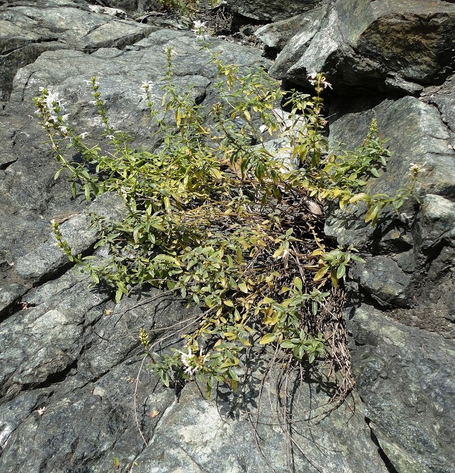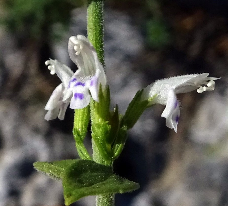 Blüten rein weiß oder weiß mit violetter Zeichnung, 5 - 6 mm lang, Oberlippe ca. so lang wie die 3- teilige Unterlippe, Kronröhre kaum länger als Ober und Unterlippe