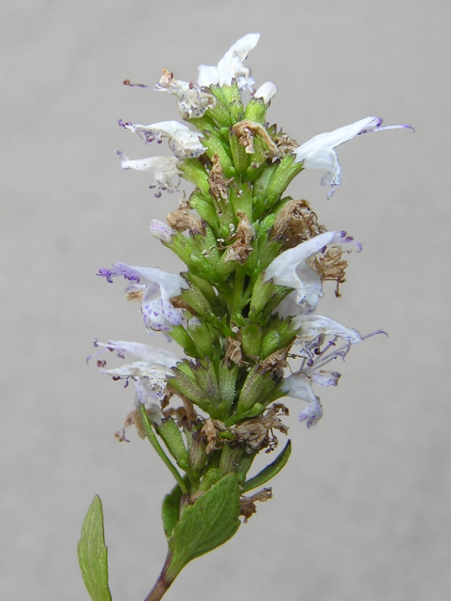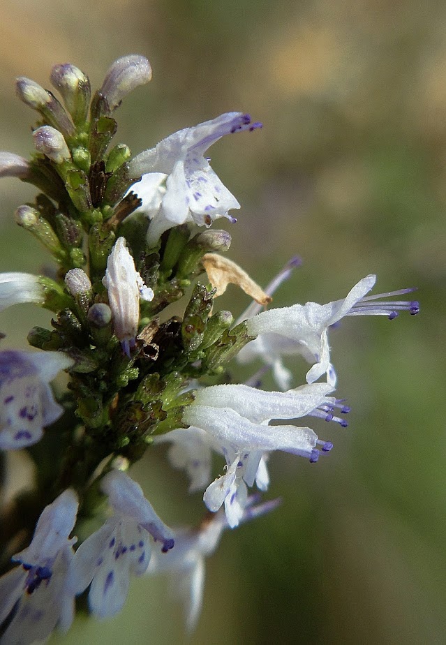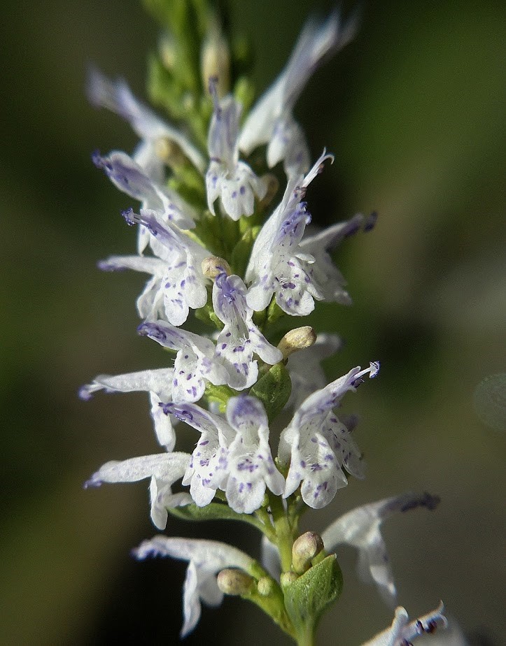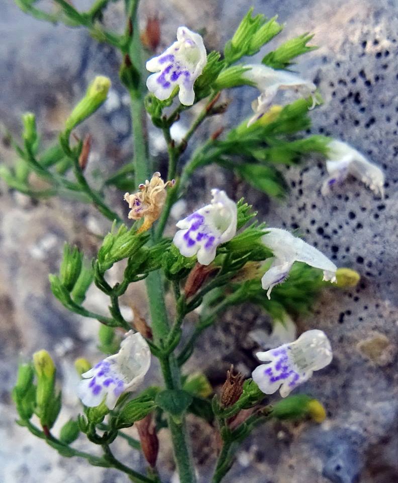 Blüten weiß, mit violetten Punkten, 5 - 9 mm lang, Oberlippe ca. so lang wie die 3- teilige Unterlippe,