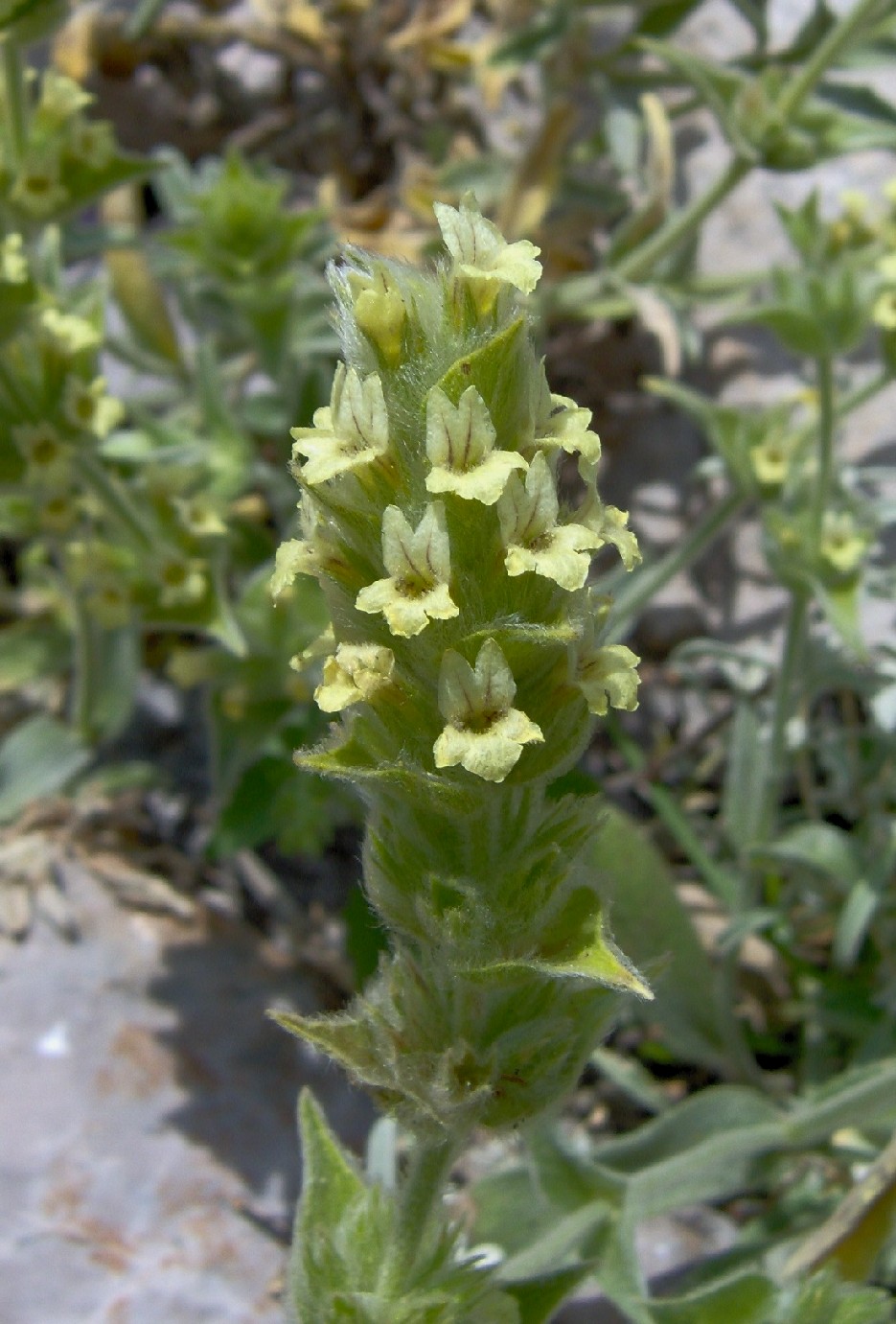 1 Verbreitung: Südpeloponnes (Parnon, Taygettos), Pflanze grau behaart, mittlere Tragblätter 1 - 3 mal so lang wie breit