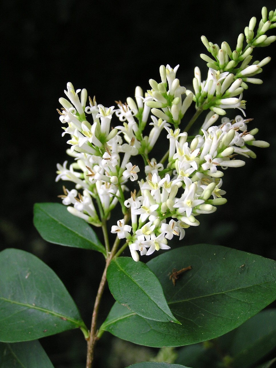 1 - 5 m hoher Strauch Blüten weiß, zu 50 - 300 in 6 - 8 cm langen Rispen; Blüten im unteren Teil zu einer Röhre verwachsen, mit 4 Kronblattzipfeln, Kelch glockig, Kronröhre ca. so lang wie die Kronzipfel, 2 Staubblätter, Fruchtknoten kugelig, Früchte schwarz, kugelig, ca. 1 cm im Durchmesser, Blätter gegenständig, Blätter länglich- lanzettlich, sommergrün, kahl, 3 - 6 cm lang