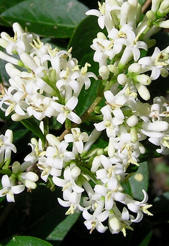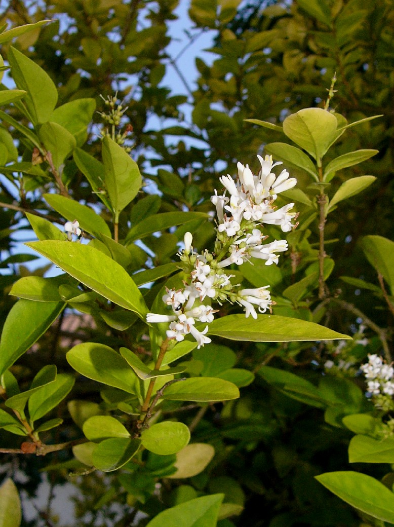 2 - 3 m hoher Strauch Blüten weiß, bis zu 150 in 5 - 10 cm langen Rispen Blüten im unteren Teil zu einer Röhre verwachsen, mit 4 Kronblattzipfeln