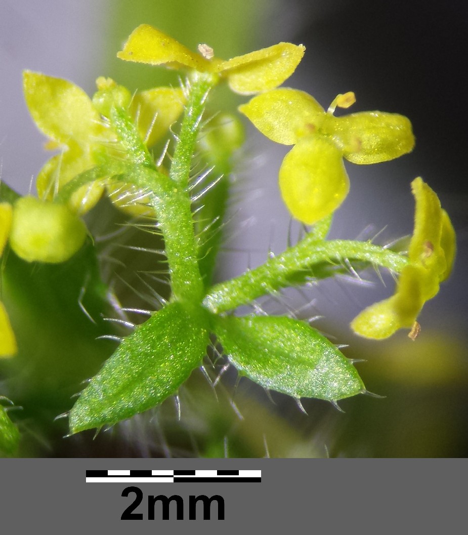 Stängel mit langen abstehenden Haaren, ohne nach rückwärts gerichtete Dornen an den Kanten, Blätter zu 4 im Wirtel, eiförmig 12 - 20 mm lang, 4- 10 mm breit, oft gelbgrün und nach unten gebogen, +/- behaart