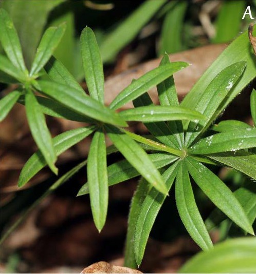 Blätter eilanzettlich, oberseits grün, zu 5 - 11 im Quirl, mit 1 Ader, Stängel ohne Stacheln,