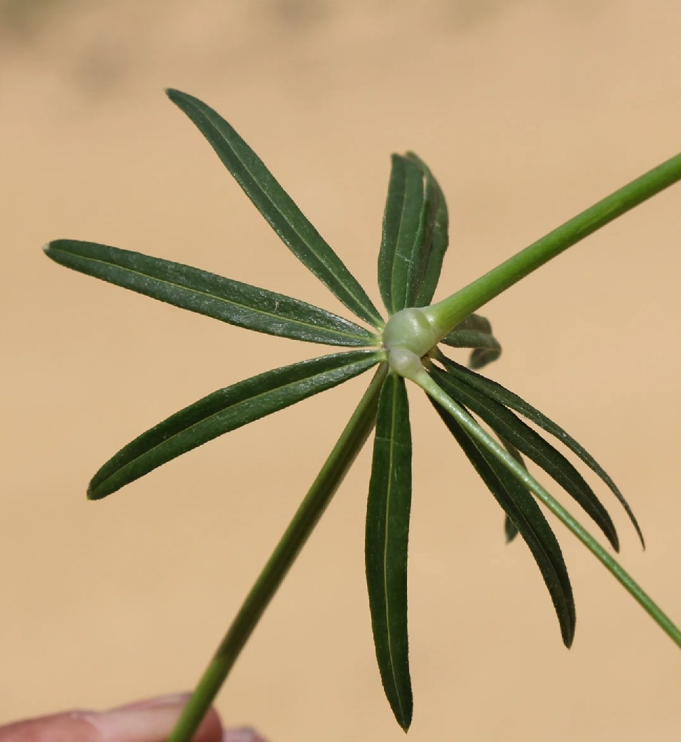 Blätter lanzettlich, oberseits grün, zu 5 - 11 im Quirl, mit 1 Ader, Stängel ohne Stacheln,