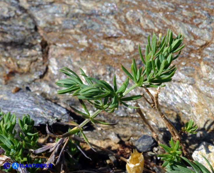 Blätter blaugrün, 0,5 - 2 mm breit, bereift, zu 5 - 8 im Quirl, mit 1 Ader, Stängel ohne Stacheln, Früchte kahl