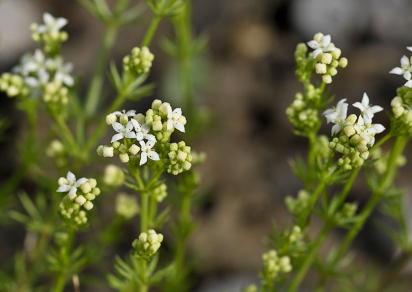 Blätter im Wirtel zu 9 - 10, schmal linealisch, 7 - 10 mm lang, 0,5 - 1 mm breit, ledrog, mit kurzem Grannenspitzchen, auf der Oberseite rau, Blattränder im vorderen Teil mit vorwärts gerichteten Zähnchen