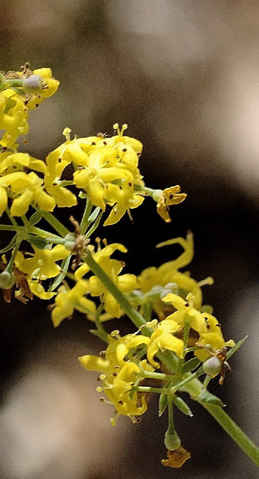 Blüten radförmig, ca. 3 mm im Durchmesser, +/- goldgelb,