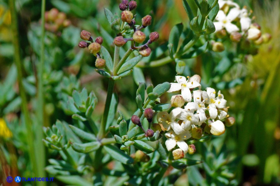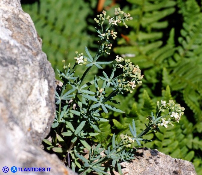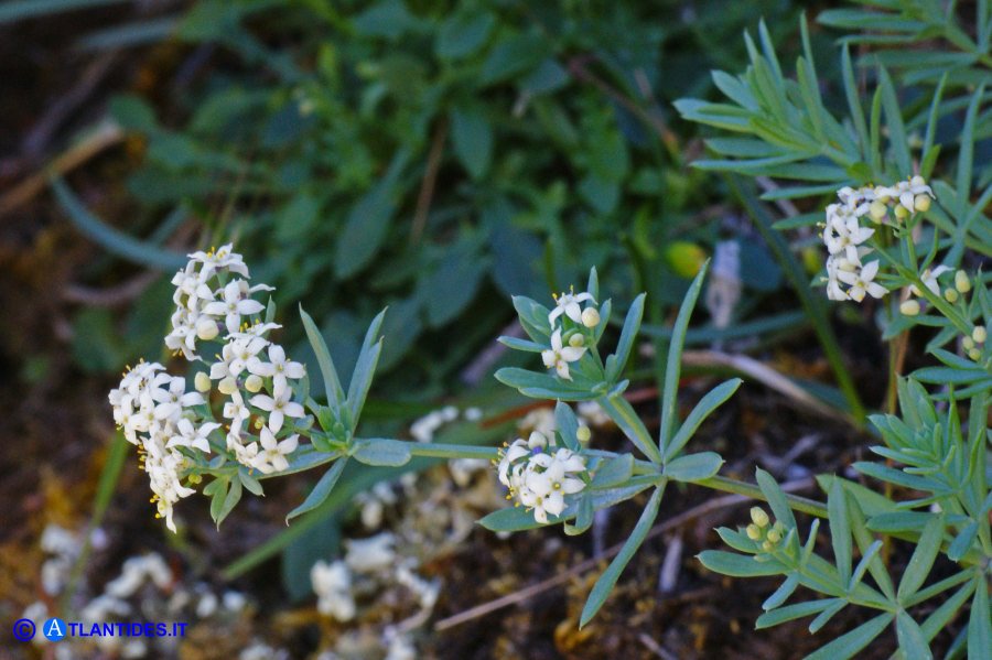 Galium - Blüten weiß, radförmig, Kronzipfel begrannt, Blätter blaugrün, bereift, 1 - 4 mm breit, zu 5 - 8 im Quirl, mit 1 Ader, Stängel ohne Stacheln, Früchte kahl oder körnig