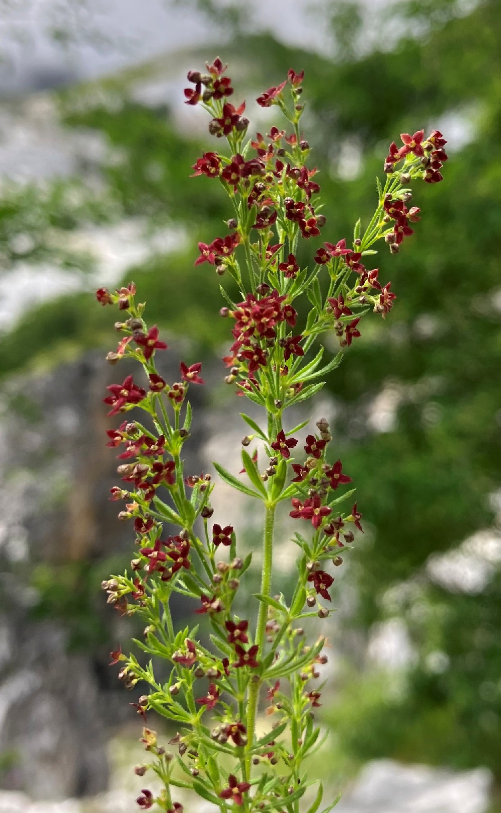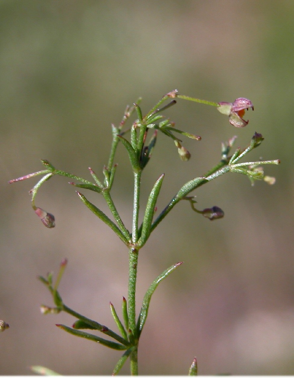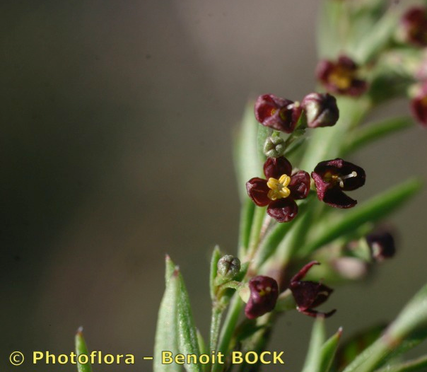Blüten radförmig, purpurn, 1 - 1,5 mm im Durchmesser, mit 4 Kronzipfeln, Kronzipfel bespitzt, Antheren gelb