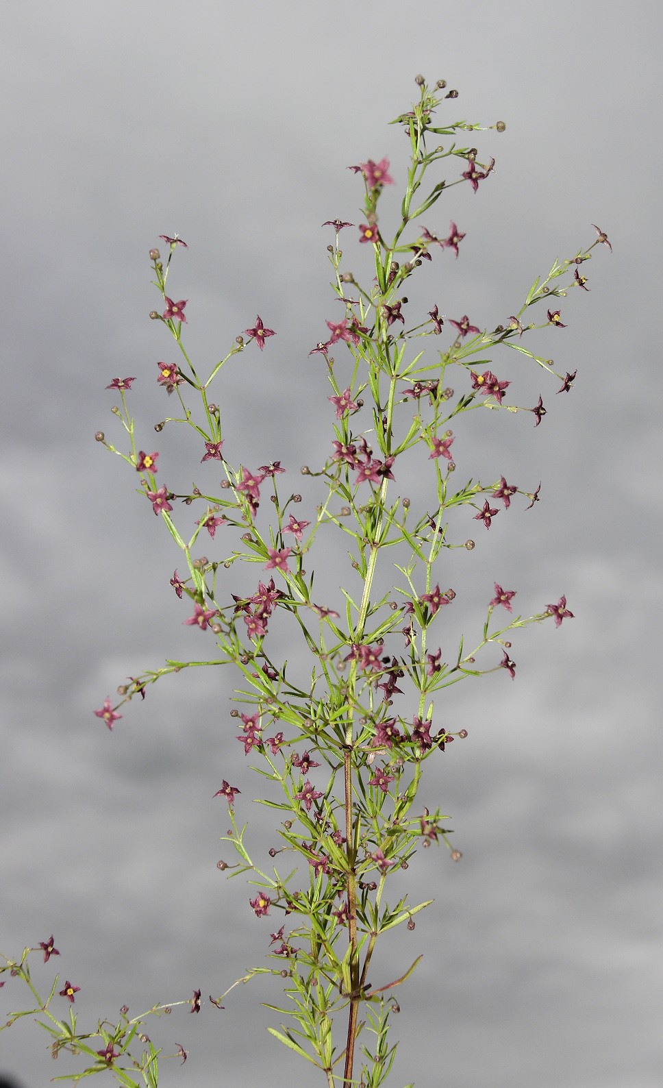 Blüten radförmig, purpurn, 2 mm im Durchmesser, mit