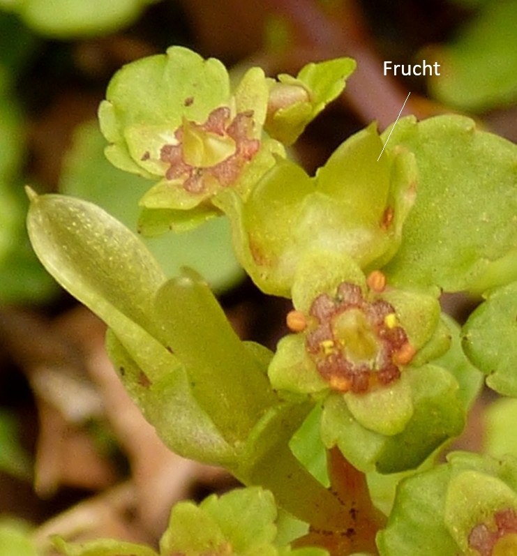Die rötlichen Samen liegen in der geöffneten, schalenartigen Kapsel und werden bei Berührung mit Wassertropfen aus der Kapsel geschleudert Stängel +/- 3- kantig