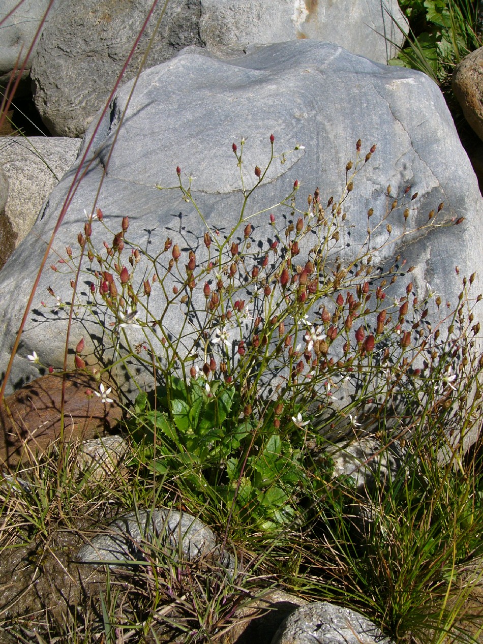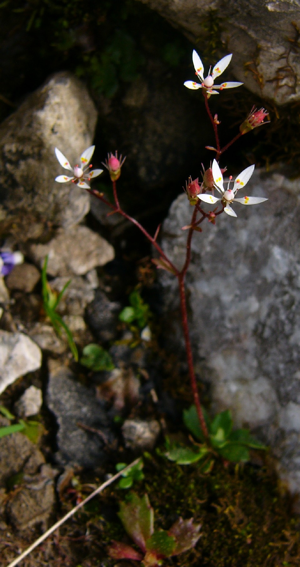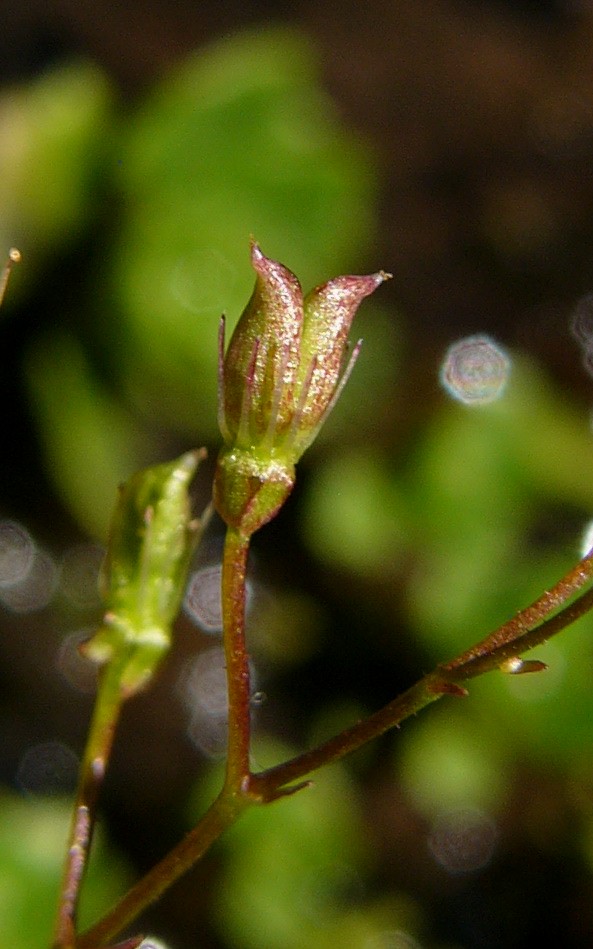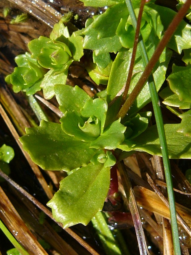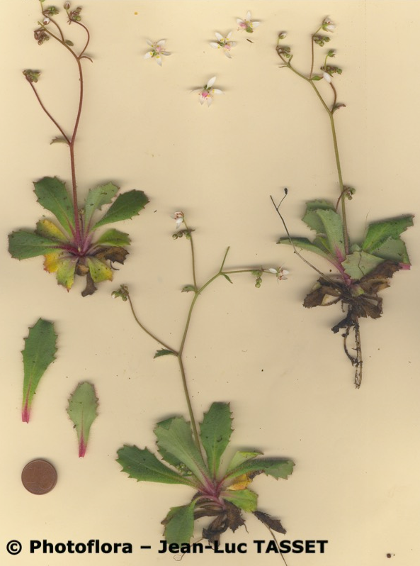 vorhanden Die beiden Fruchtblätter sind im unteren Teil verwachsen, mit freien und auseinander weisenden Enden bzw. Griffeln, Kelchblätter lanzettlich, bei fruchtenden Pflanzen nach unten geschlagen, Reste der Staubblätter oft haftend Samen gerippt Grundblätter rosettig, keilförmig, vorne mit 3 - 7 Zähnen Rosettenblätter 12 - 25 mm lang, 7 - 12 mm breit,