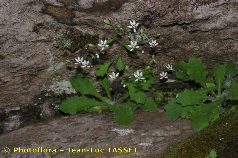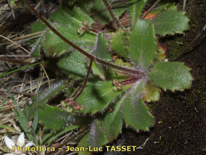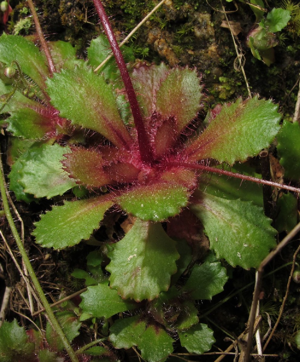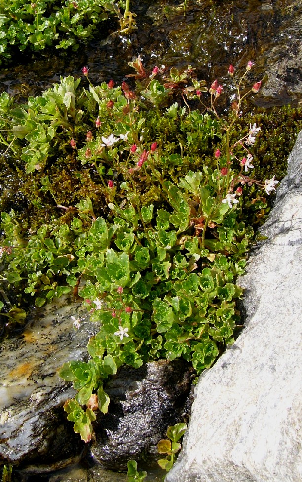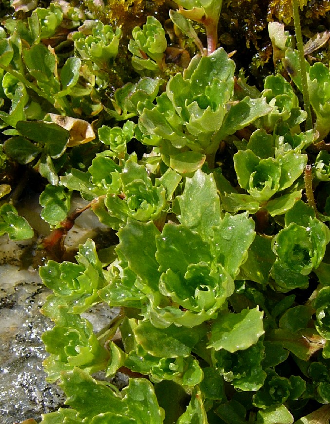 vorhanden Die beiden Fruchtblätter sind im unteren Teil verwachsen, mit freien und auseinander weisenden Enden bzw. Griffeln, Kelchblätter lanzettlich, bei fruchtenden Pflanzen nach unten geschlagen, Reste der Staubblätter oft haftend Samen gerippt Grundblätter rosettig, keilförmig, vorne mit 3 - 7 Zähnen Rosettenblätter 12 - 25 mm lang, 7 - 12 mm breit,