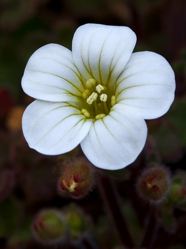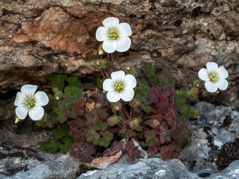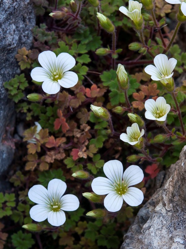 Saxifraga - Blüten weiß, ohne Punkte, Kronblätter abgerundet, innen kahl, Blätter 2- fach dreiteilig, weich, rundlich, nicht kalkausscheidend, ohne Brutknospen in den Achseln der Stängelblätter
