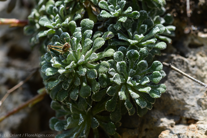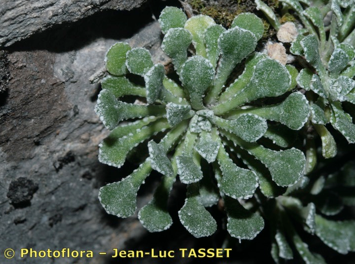 Grundblätter löffelförmig, 10 - 30 mm lang, vorne +/- abrupt in eine rundliche, stumpfe Spitze erweitert, mit Kalk ausscheidenden Grübchen am Rand