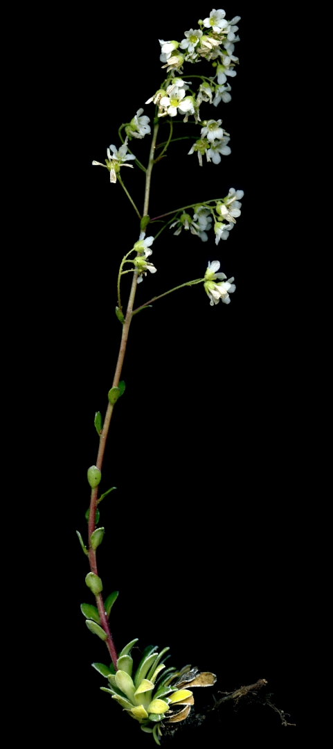Grundblätter spatelförmig, 12 - 30 mm lang, 4 - 6 mm breit, steif, abstehend oder zurückgebogen, am Rand mit Kalk ausscheidenden Grübchen