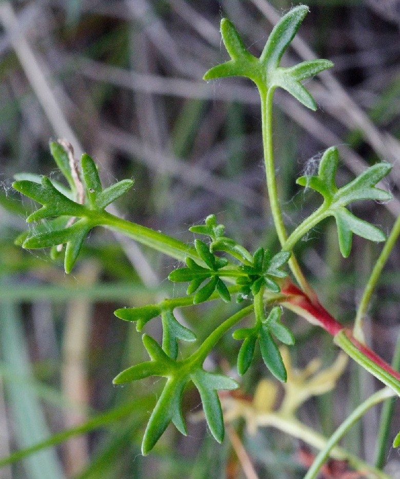 Grundblätter kahl, ledrig, 25 - 40 mm lang, 15 - 20 mm breit, handförmig geteilt, mit 9 - 11 Lappen, mittlerer Lappen der Grundblätter linealisch, 7 - 12 mm lang, meist 3- teilig, Sekundärlappen 1 - 2 mm breit, die äußeren +/- sichelförmig, am Rand verdickt, ohne Furchen, Blattlappen mit Spitzchen, Blattstiel ca. so lang wie die Blattspreite, 1 mm breit, rinnig