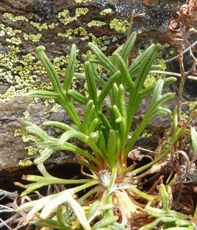 Mittlerer Lappen der Grundblätter linealisch, 4 - 6 mm lang, 0,5 - 1 mm breit, 3 - 6 mal so lang wie breit, oberseits mit 1 feinen Furche, Blattlappen mit Spitzchen, Blattstiel ca. so lang wie die Blattspreite, 1 mm breit, gefurcht