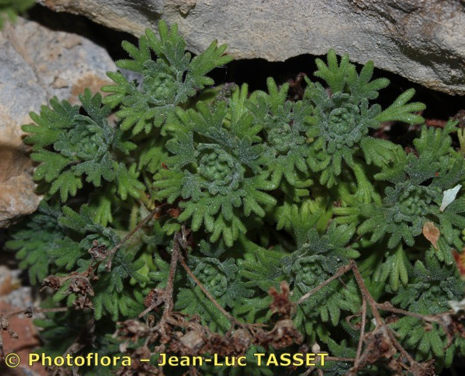 Grundblätter in dichten kugeligen Rosetten, 4 - 8 mm lang, 3 - 4 mm breit, drüsig behaart, oberseits mit feiner Furche, vorne mit 3 - 5 fingerförmigen, kaum spreizenden Blattlappen, Mittellappen 2 - 3 mm lang, 0,5 mm breit, 2 mal so lang wie breit, vorne stumpf, allmählich in einen breiten Stiel übergehend