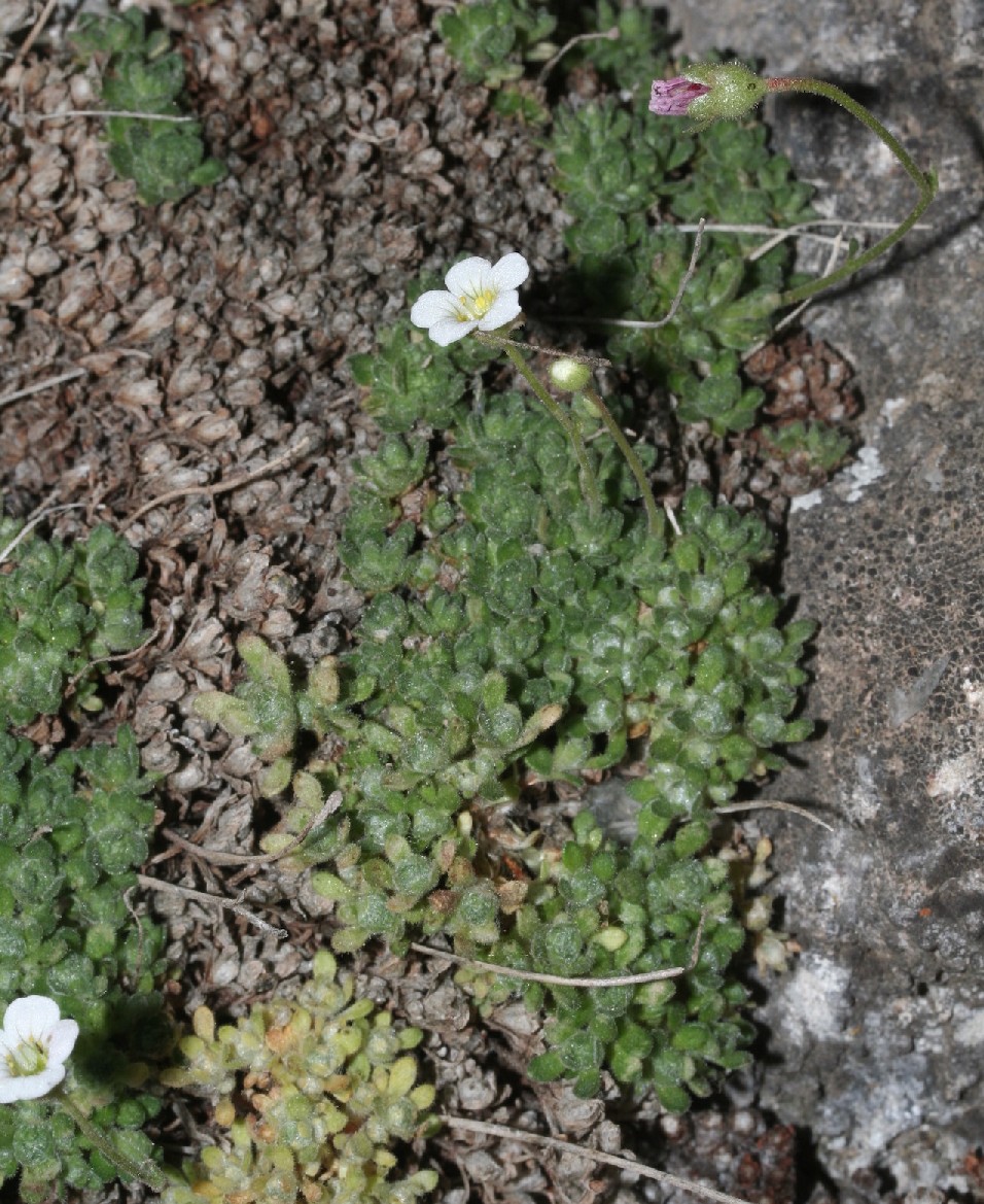 Grundblätter rosettig, 3 - 8 mm lang, 1 - 2 mm breit, aufrecht, ganzrandig, spatelförmig, ungestielt, drüsig behaart, vorne stumpf