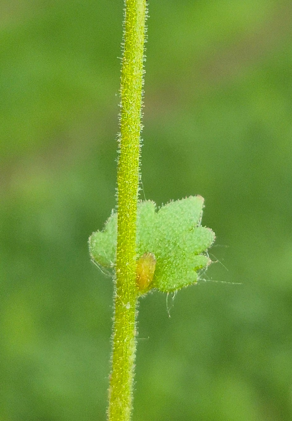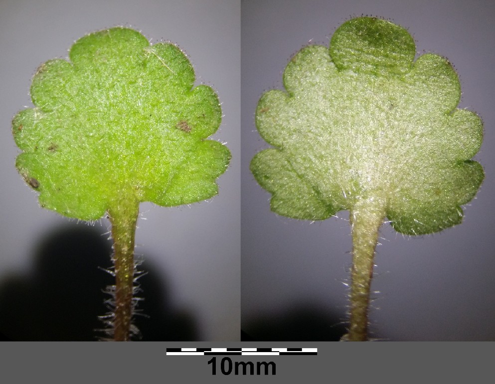 Grundständige Blätter behaart, lang gestielt, nierenförmig, mit unregelmässigen Einkerbungen, Lappen stumpf, Blattstiel langhaarig