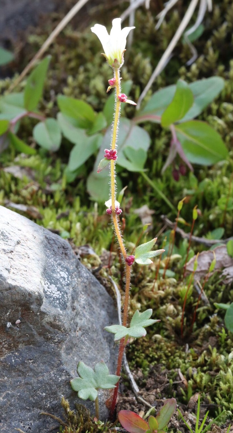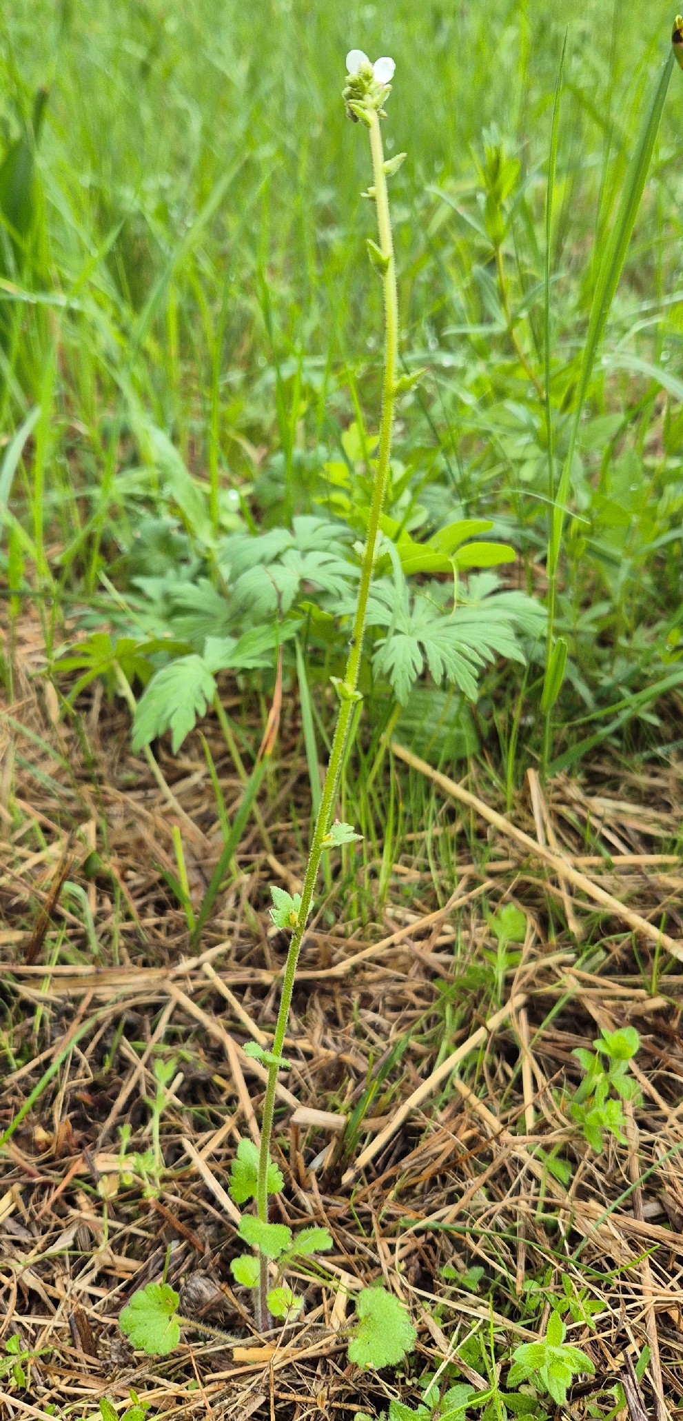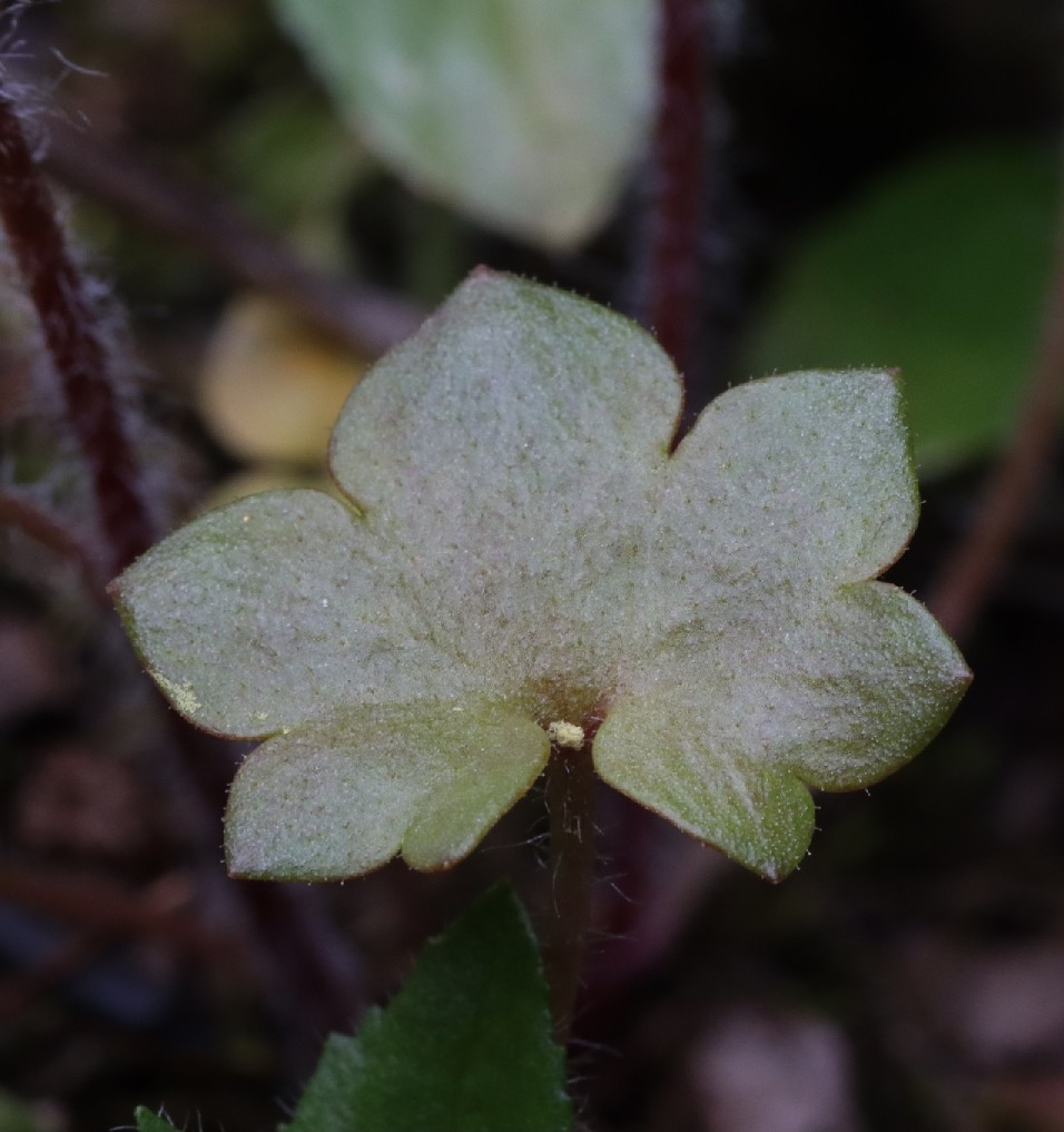 Grundständige Blätter 5 - 18 mm lang, 9 - 25 mm breit, nierenförmig, 5 - 7- lappig oder -spaltig, mit breit gerundeten, +/- spitzen Abschnitten, kahl, nur die Blattstiele kraus behaart