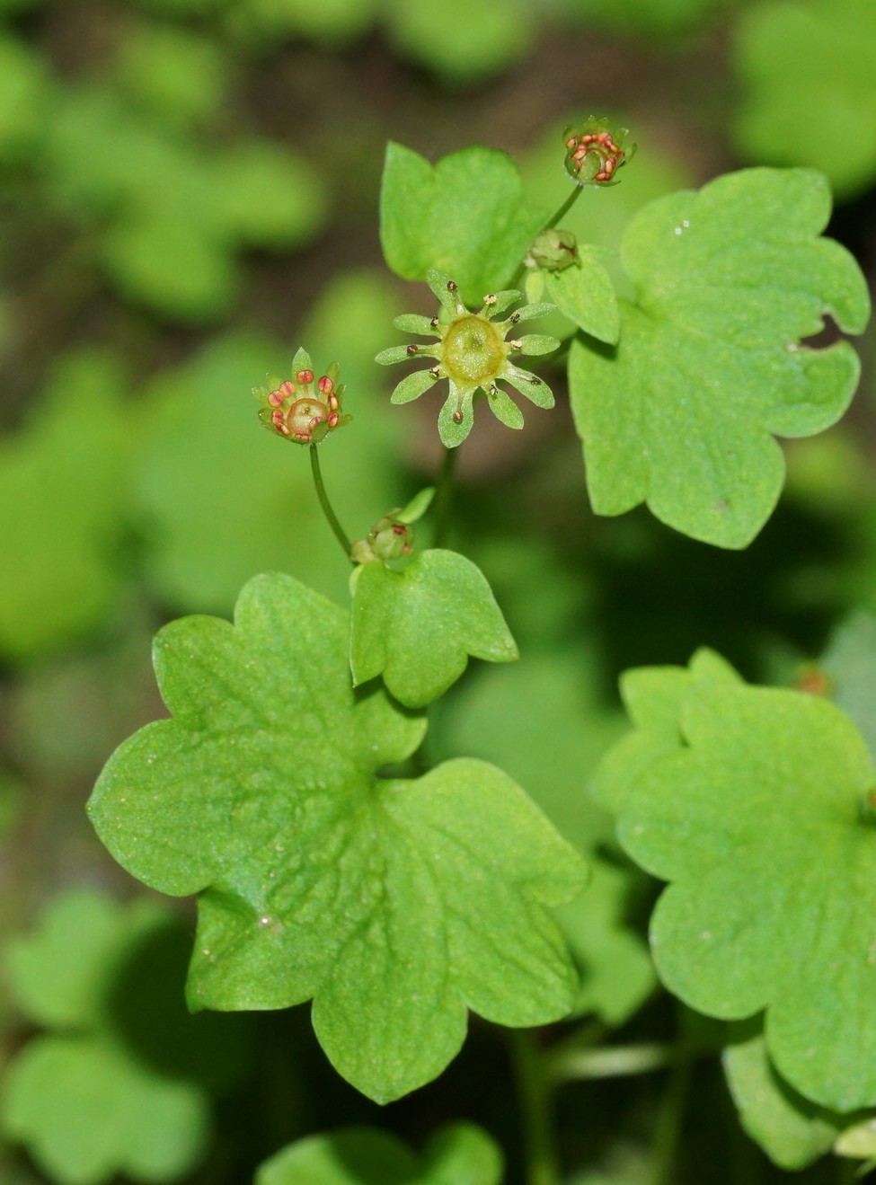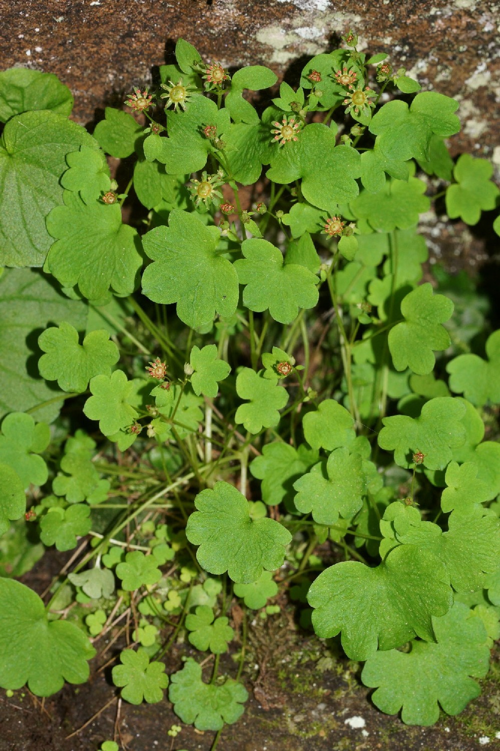 Grundblätter rundlich nierenförmig, 20 - 30 mm im Durchmesser, zart, handförmig gelappt, mit 5 - 7 ganzrandigen Abschnitten, Blattlappen stumpf oder spitz, beiderseits +/- kahl