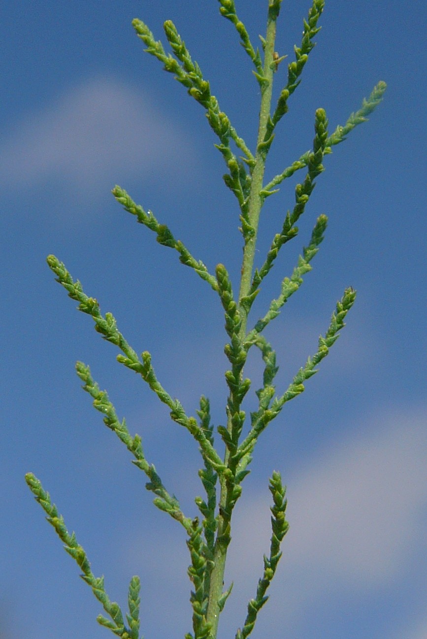Blätter an jungen Zweigen dachziegelig, 1 - 3 mm lang, +/- gekielt, am Grund stängelumfassend, vorne spitz, Blattrand durchscheinend, mit oder ohne salzauscheidende Drüsen
