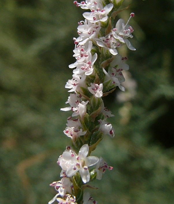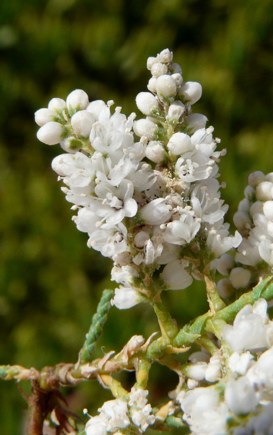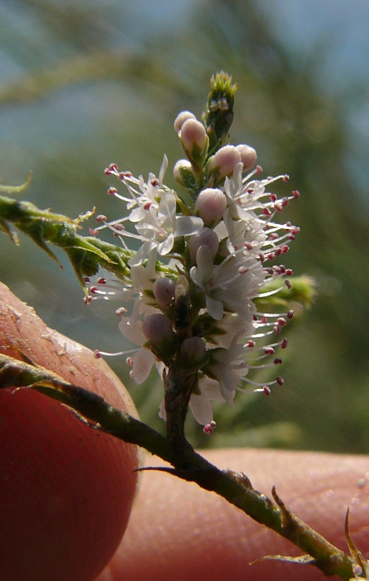 2 - 3 m hoher Strauch oder Baum Blüten in dichten, 10 - 30 mm langen, 3 - 5 mm breiten Trauben, Blüten meist mit 5 Kronblättern, Kronblätter