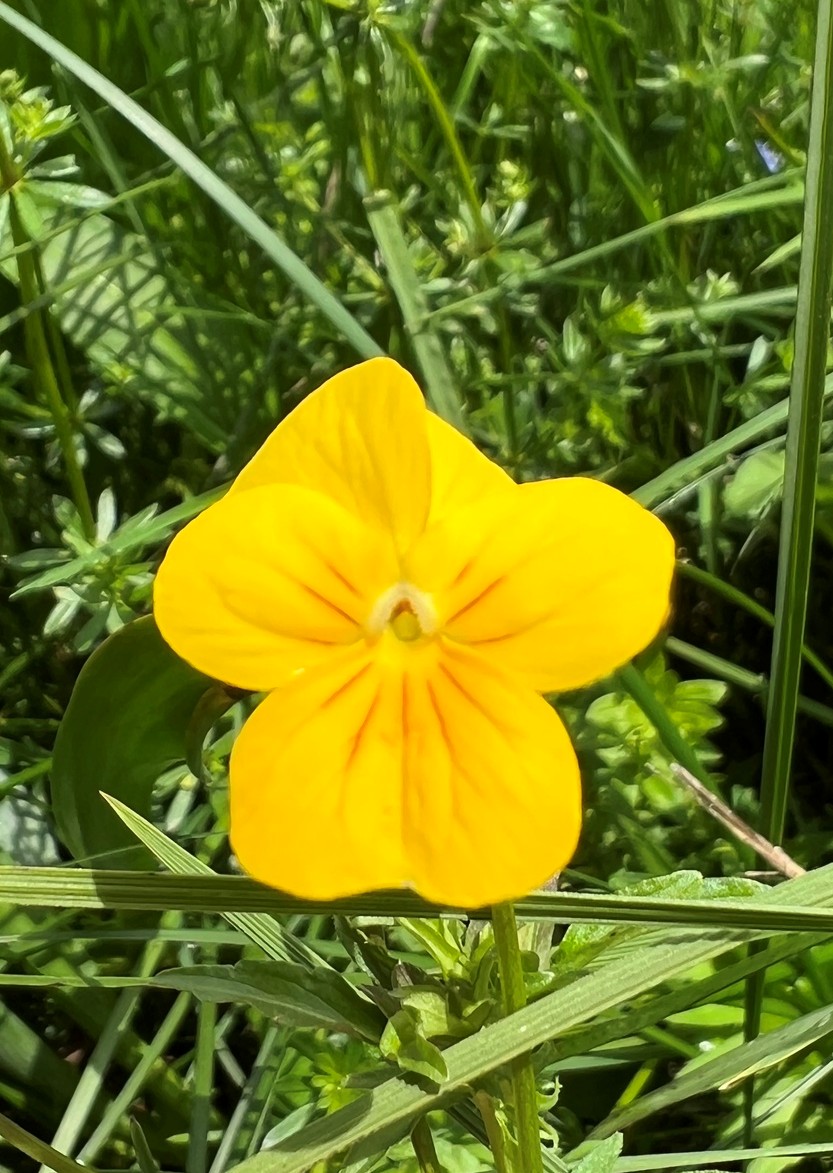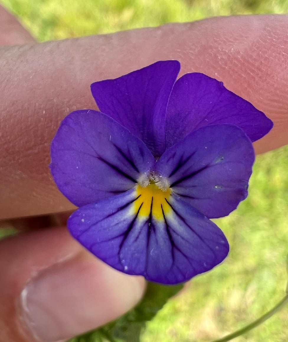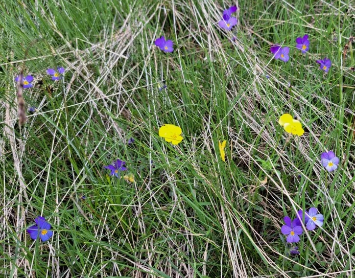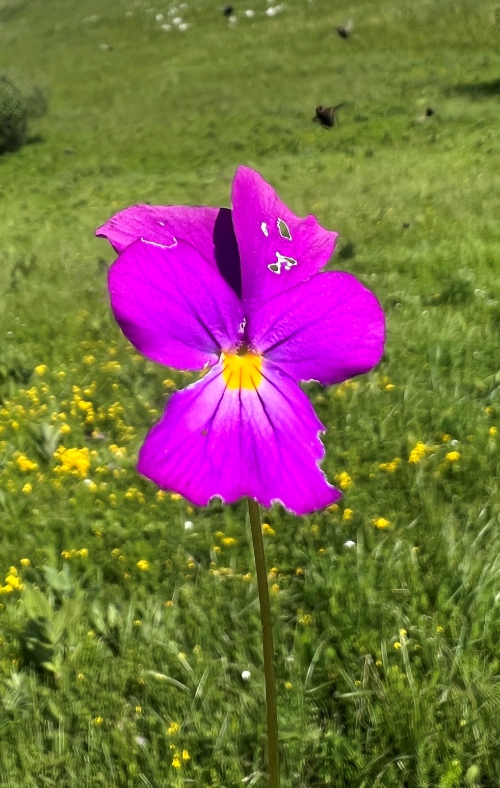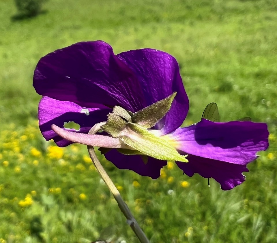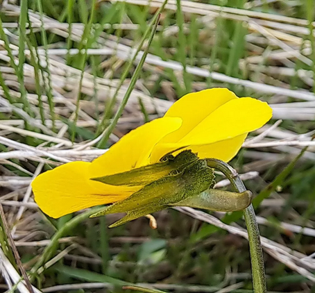 3 Blüten 25 - 30 mm hoch, gelb oder violett, Kelchblätter nicht gezähnt