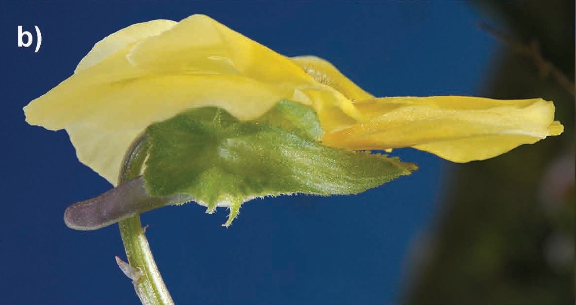 4 Blüten 16 - 25 mm hoch, dottergelb, Kelchblätter meist gezähnt