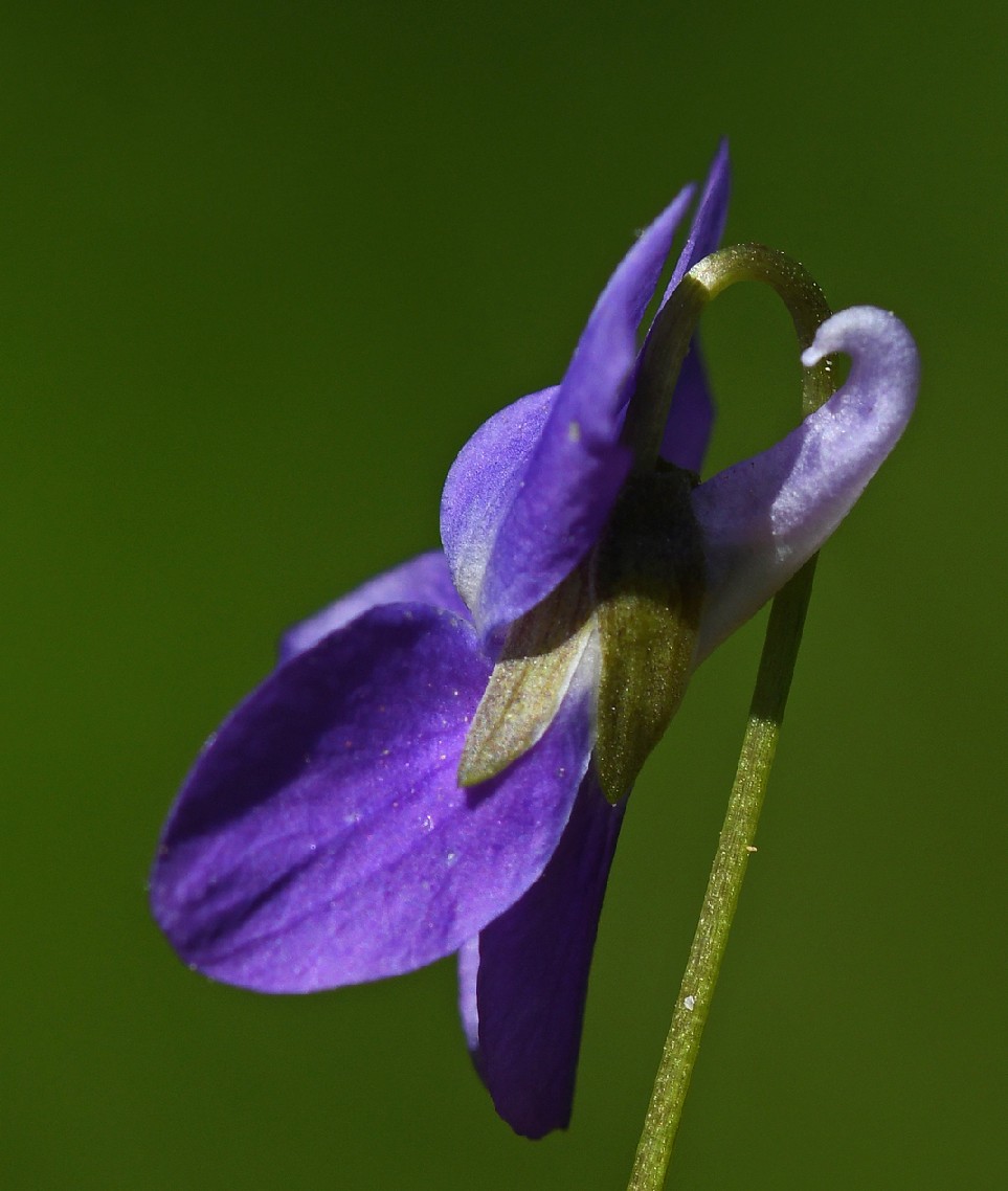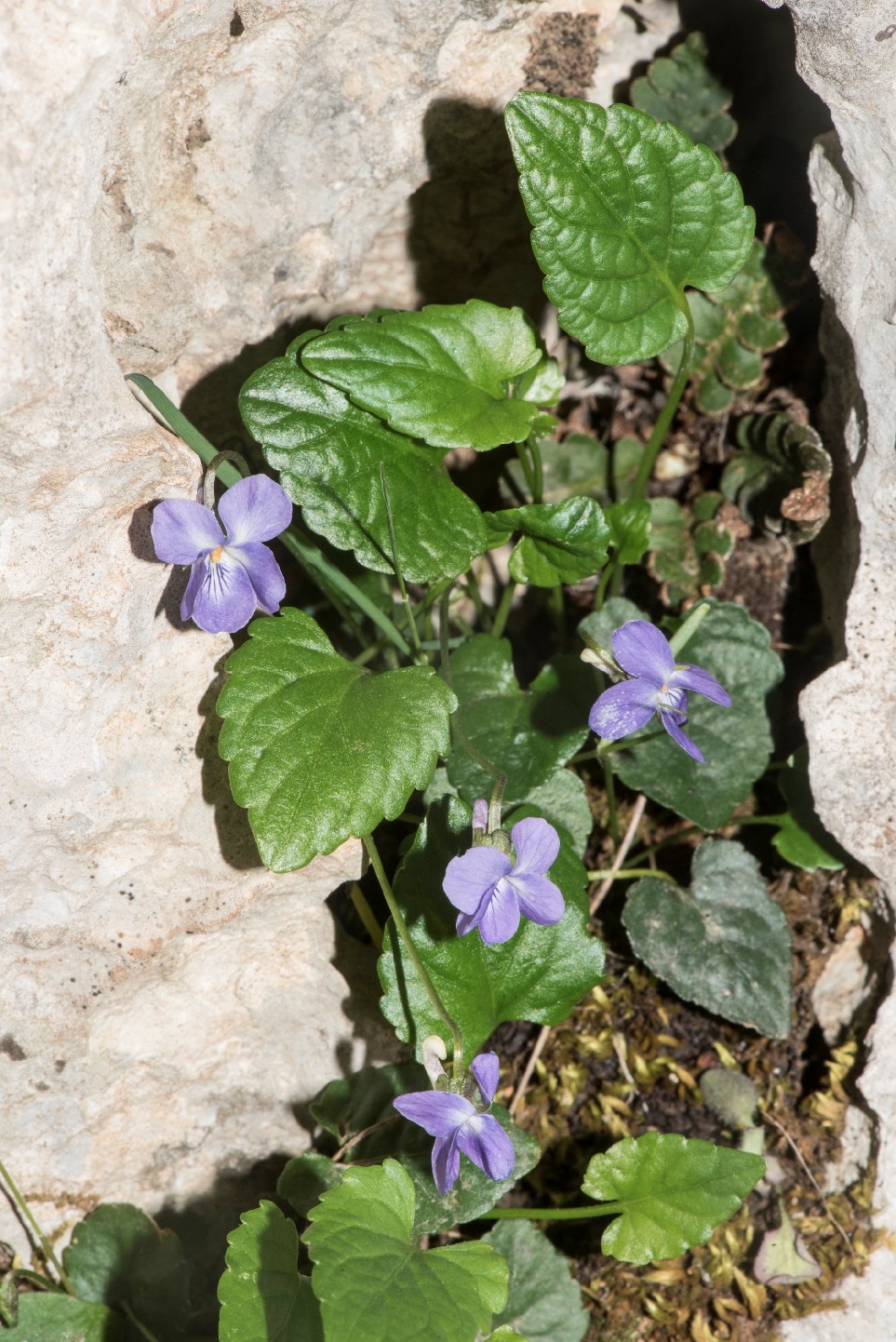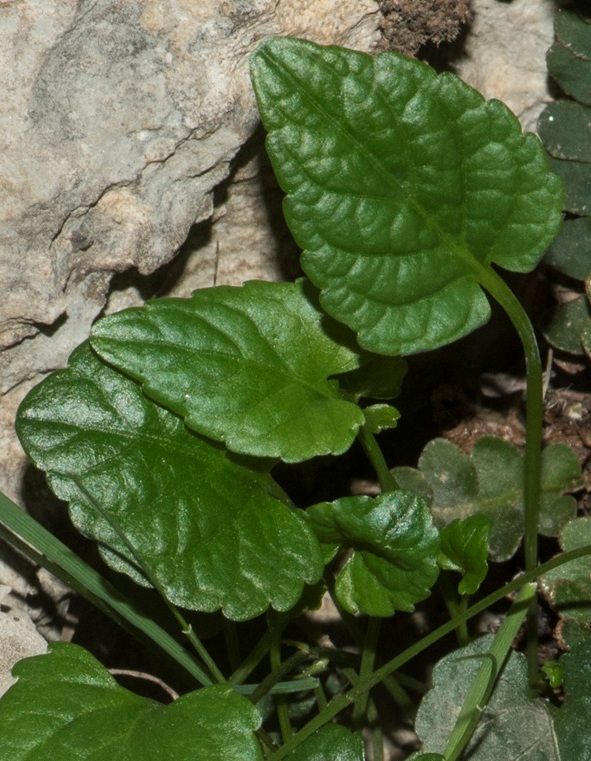Viola - Blüten hellviolett, nicht gefleckt, seitliche Kronblätter abwärts gerichtet, bartlos, Kelchblätter stumpf, Blätter länger als breit, Blüten-, Blattstiele oder Blätter behaart,