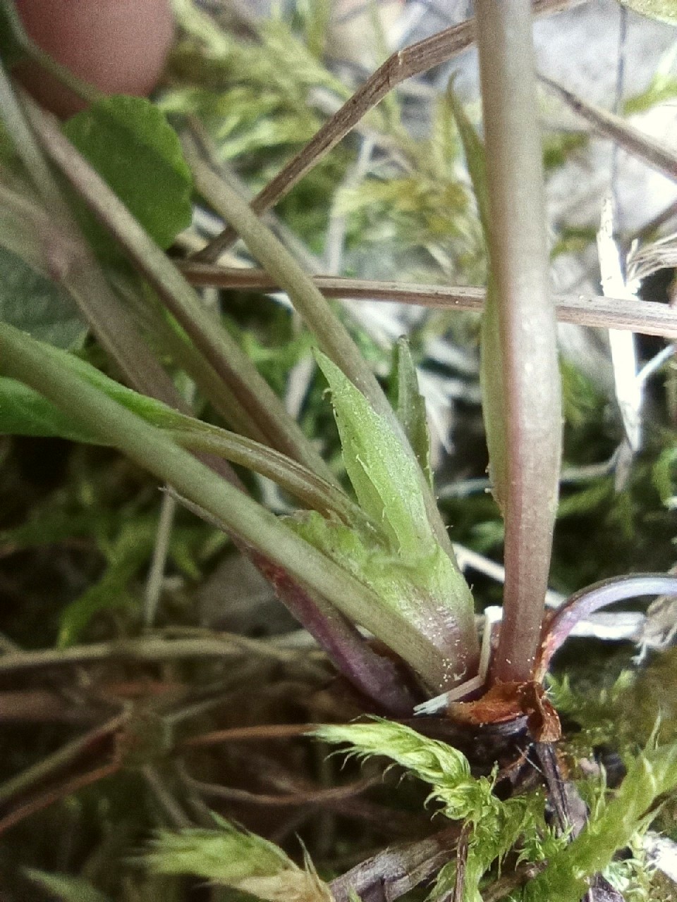Grundständige Rosetten zunächst tütenförmig zusammengerollt Entrollte Blätter meist breiter als lang, groß (im Frühjahr bis 4 cm, im Sommer bis 10 cm lang), lang gestielt (Stiele im Frühjahr bis 8 cm im Sommer bis 20 cm lang) Stängel und Blattstiele einreihig behaart Nebenblätter der Grundblätter breit lanzettlich Im Sommer: