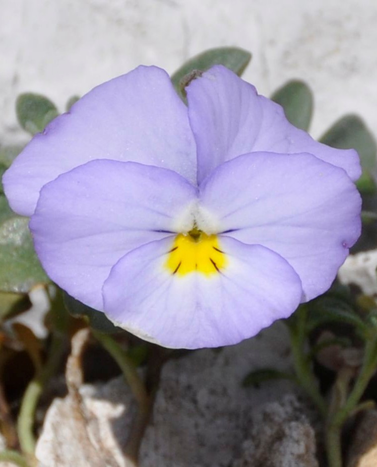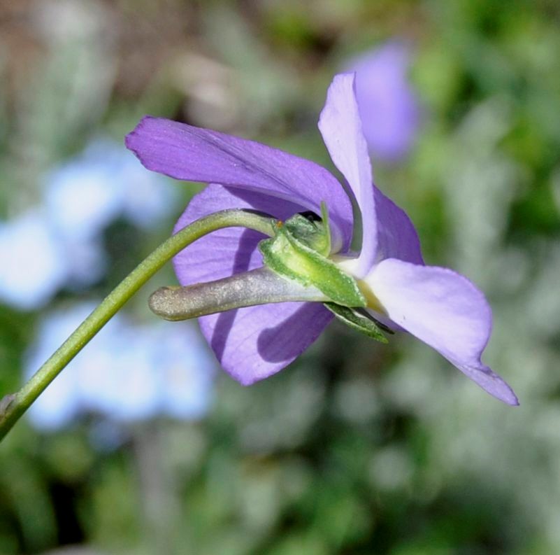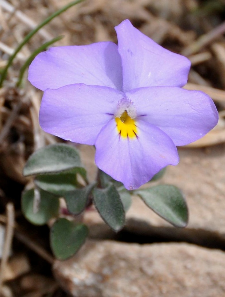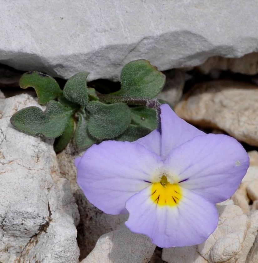 Blütenstiel sehr kurz, Blüten deswegen oft auf Bodenniveau Blüten hellviolett, in der Aufsicht oft breiter als lang, Blätter eirundlich, behaart > 1