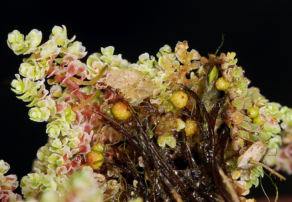 Sporokarpien rundlich, auf der Unterseite der Blätter In den Sporokarpien befinden sich Sporangien, die entweder 1 Makrospore („weibliche“ Spore) oder viele Mikrosporen ("männliche" Sporen) enthalten. Die männlichen Sporen sind von einem Perispor eingehüllt, das außen zahlreiche kleine Widerhaken (= Glochidien) besitzt. Diese Glochidien durch Scheidewände gekammert An den Unterlappen der Seitenäste befinden sich bräunliche Wurzeln
